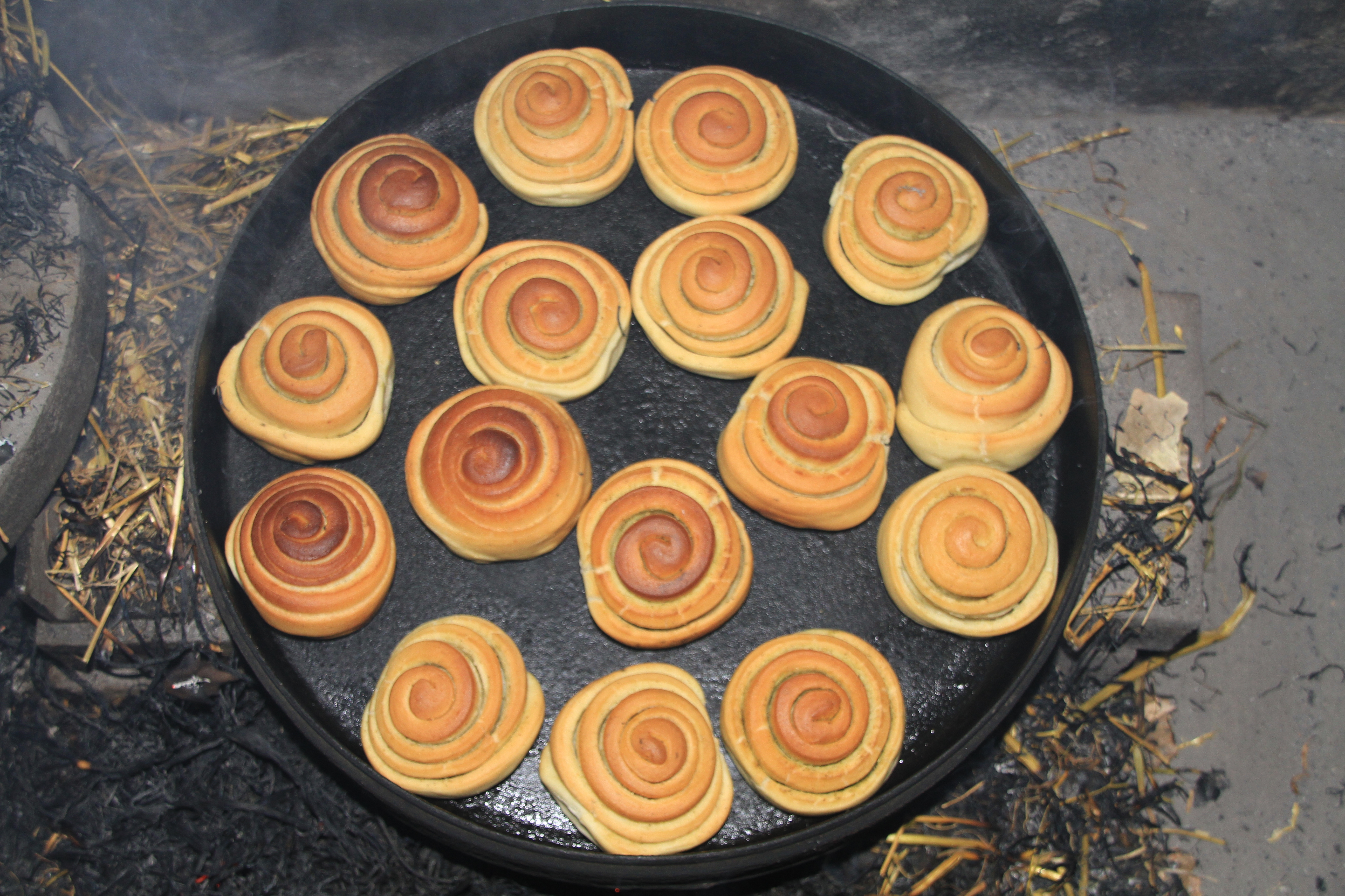 烧壳子制作时要用酵母把面发好对适量碱,将烧锅架起来,用麦草烧热,把面擀成烧锅大小圆形,放入热锅内盖上盖,扒开烧好的火堆,将带有火星的柴灰盖一部分到烧锅盖上。烧锅系生铁铸成,形状似带盖的圆铁盒,盖中间有挑盖的耳子,有大有小。由于上下左右四面加温,里面的烧饼上下和边缘都上火,烤得黄而脆。