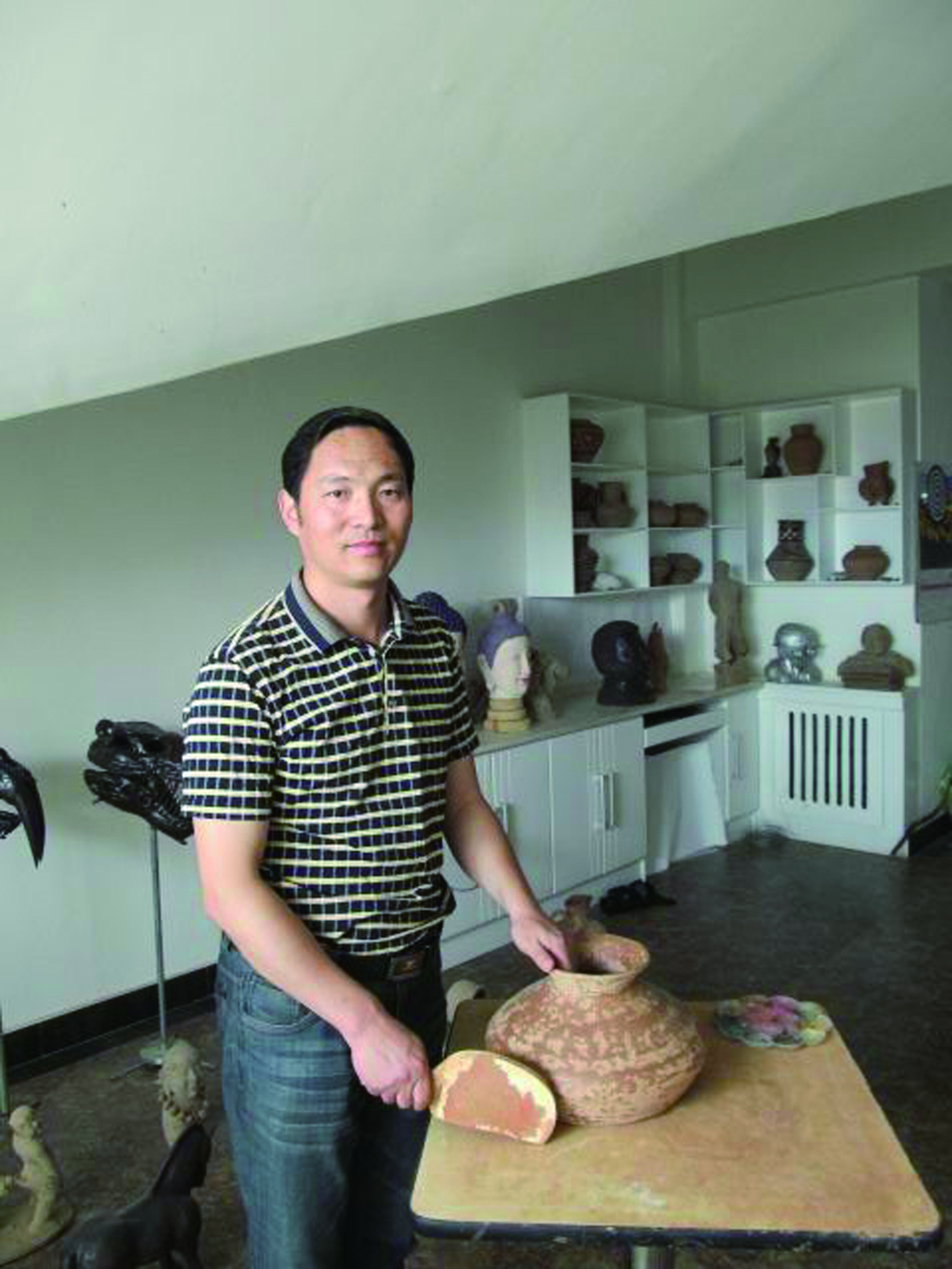 十几年前,有一次他和朋友们去黄草营玩,正好天下雨了,就到当地老乡家里去躲雨,老乡院子的角落里就堆放了当地的一种红土,是用来打泥坯的,当时,泥土已经被雨淋湿,他用手一摸,感觉到细细滑滑的,非常细腻,就产生用这种泥土创作的想法。做泥塑作品过程还是比较复杂,必须要等到下班休息的时间,先要去找到合适做泥人的土,挖到土之后就要像和面一样揉土、揉泥,为了防止泥土干裂,在揉土过程中,需要添加一些盐和棉花,由于嘉峪关的土碱性比较大,干了以后发白,还要适度添加一些草酸。等土做好之后就可以开始创作,一般创作好之后还要干燥和彩绘,一个作品至少需要一周或者以上的时间。