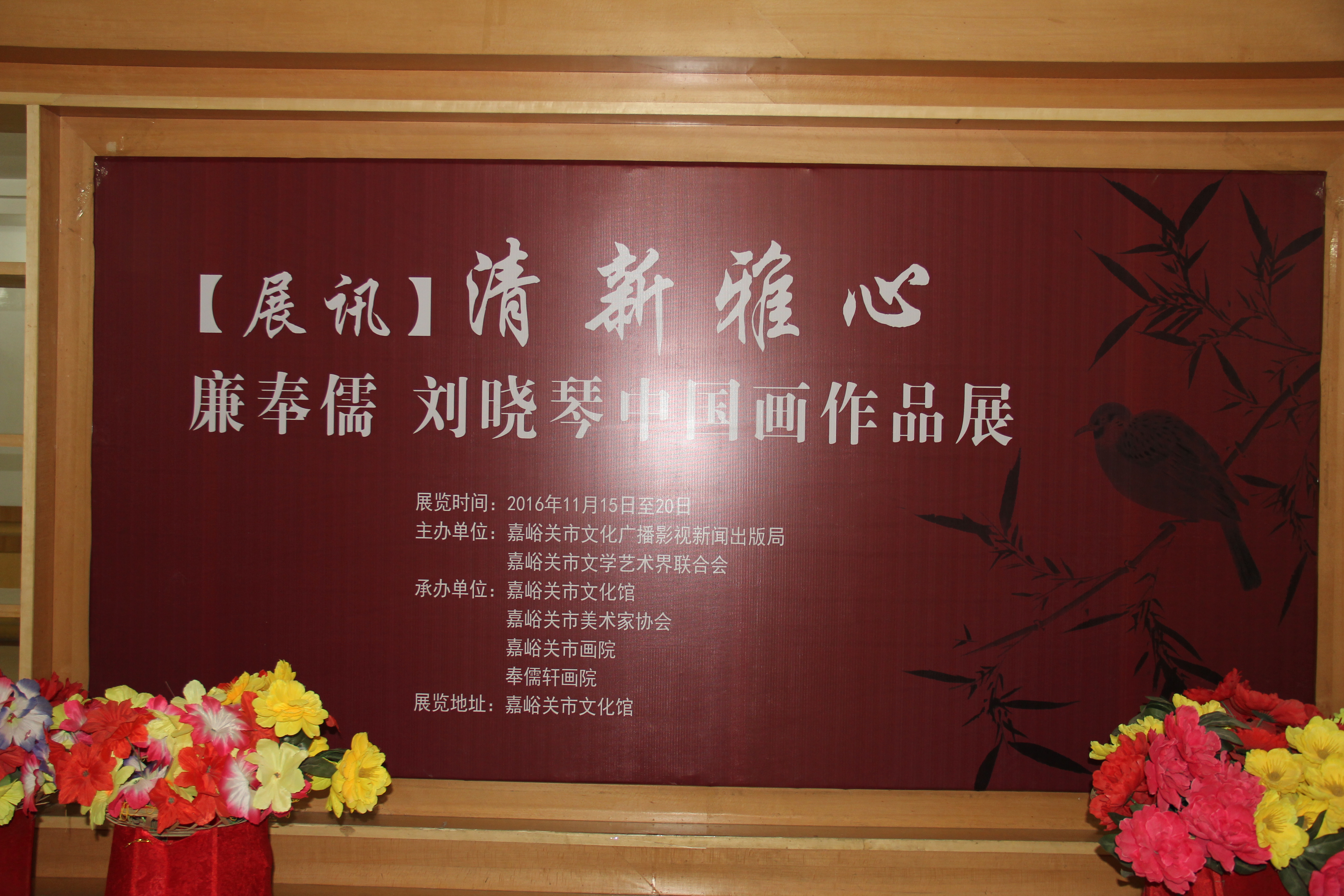 2016年11月15日—20日,由嘉峪关市文化广播影视新闻出版局、嘉峪关市文学艺术界联合会主办,嘉峪关市文化馆、嘉峪关市美术家协会、嘉峪关市画院、奉儒轩画院承办的“清新雅心—廉奉儒、刘晓琴中国画作品展”在市文化馆开展。此次画展共展出他们独具特色的写意花鸟画作品113幅。