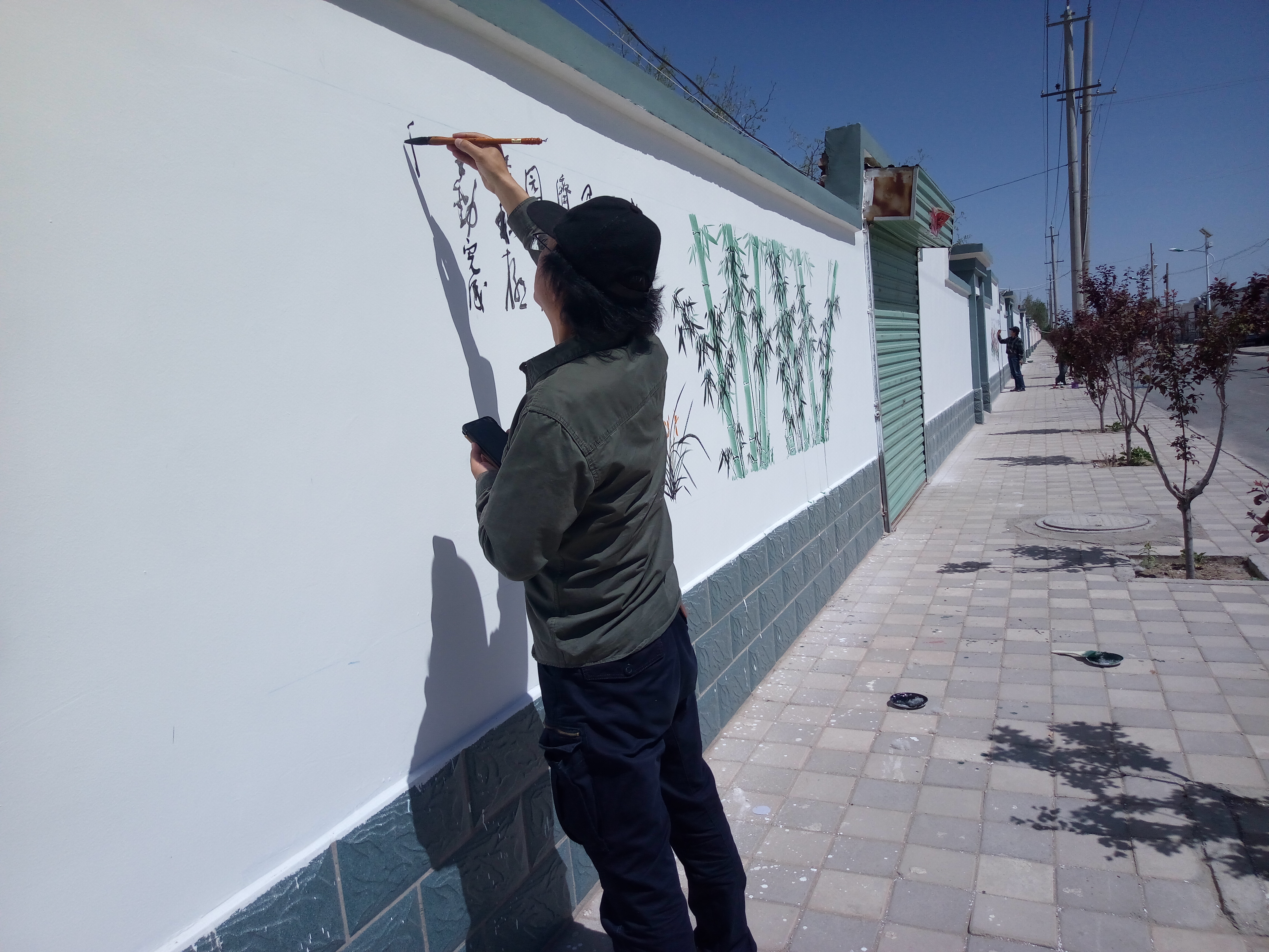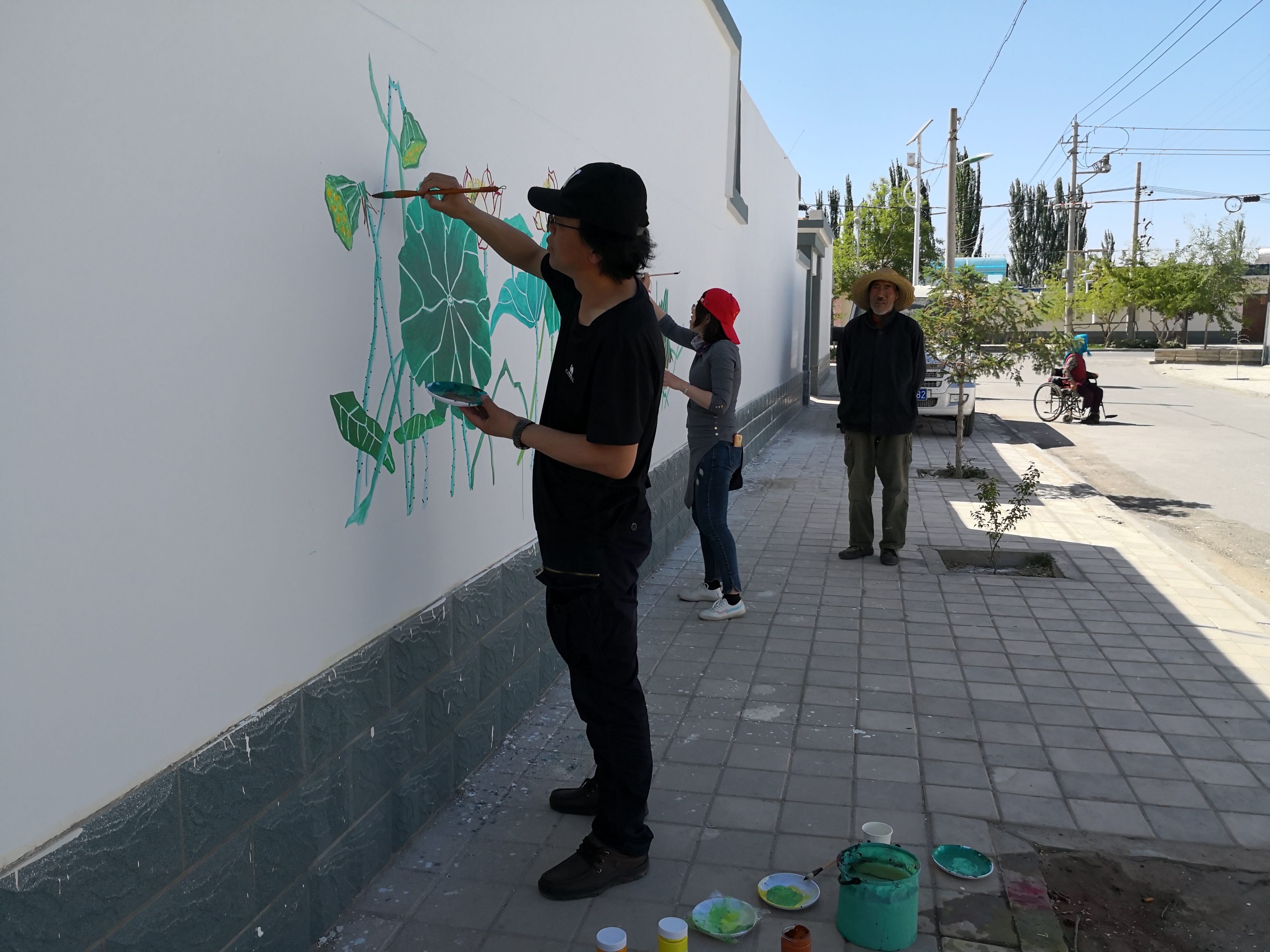 志愿者们刚一下车,村民们就热情的打招呼:“画家们又来为我们画墙啦!”大家分工明确,热火朝天的画起来。汗水和着颜料,在漫天飞舞的柳絮中,闪动着一个个舞动的身影。