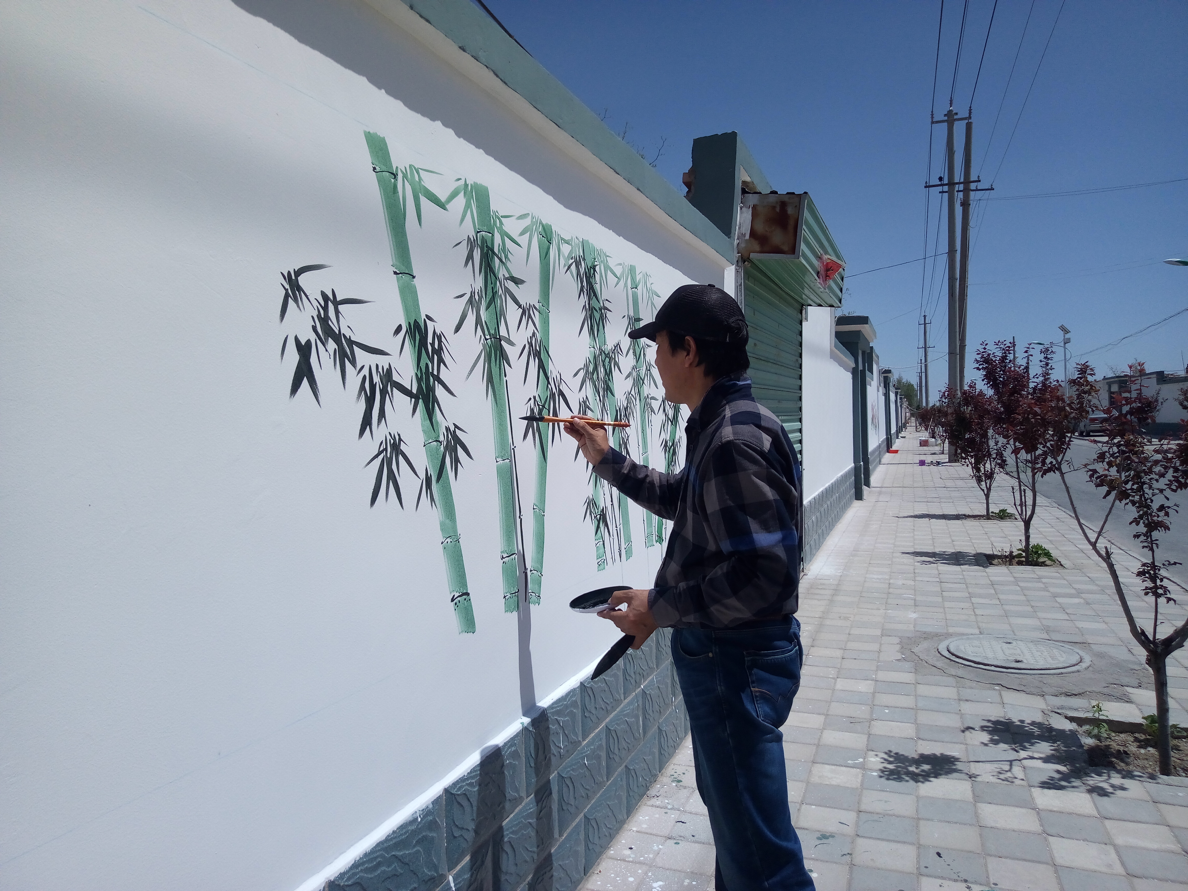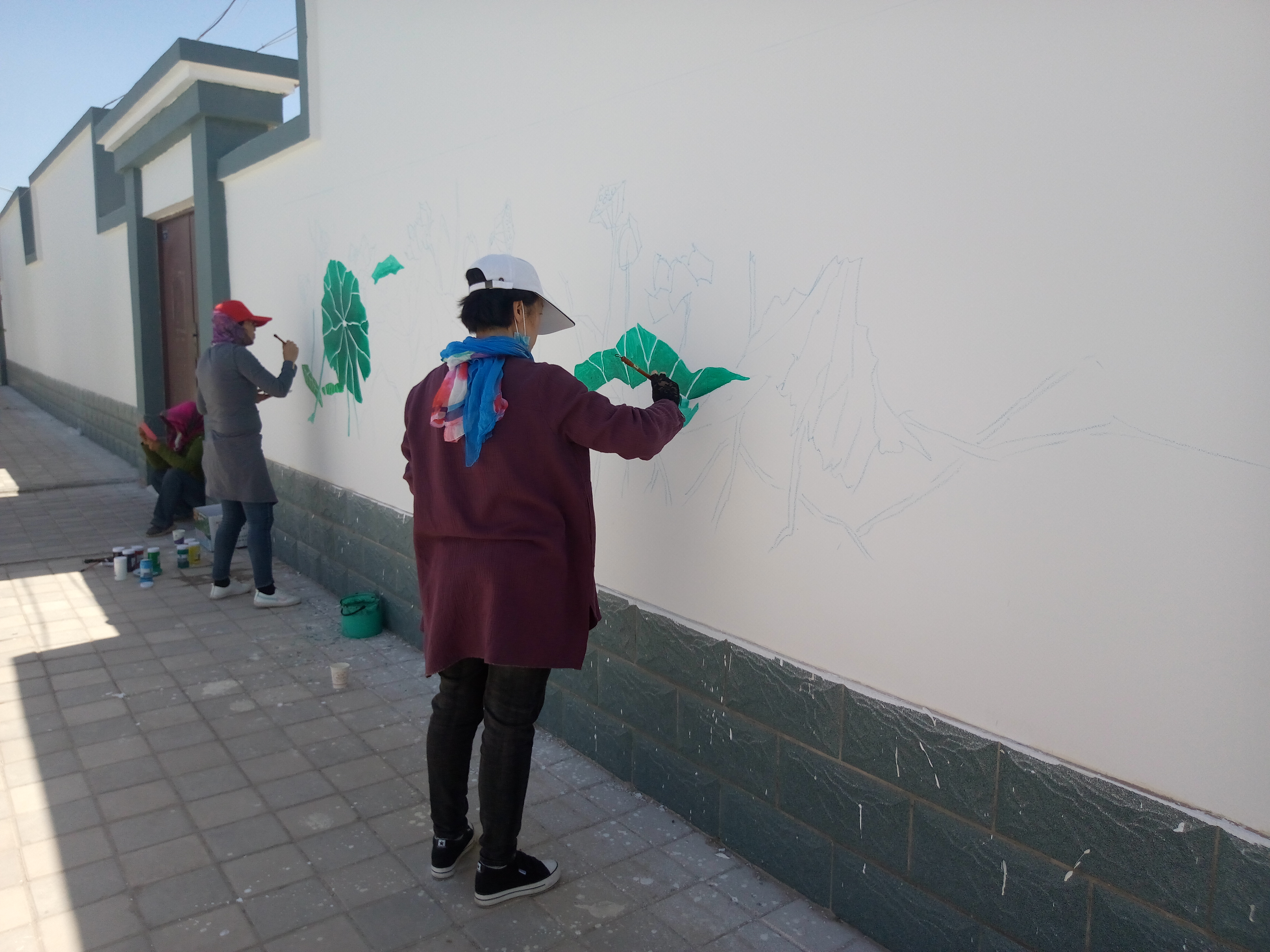 近日,气温回暖,温度极速上升,可这对下乡绘制文化墙的文化志愿者们来说,却有些“热情过度”啦!