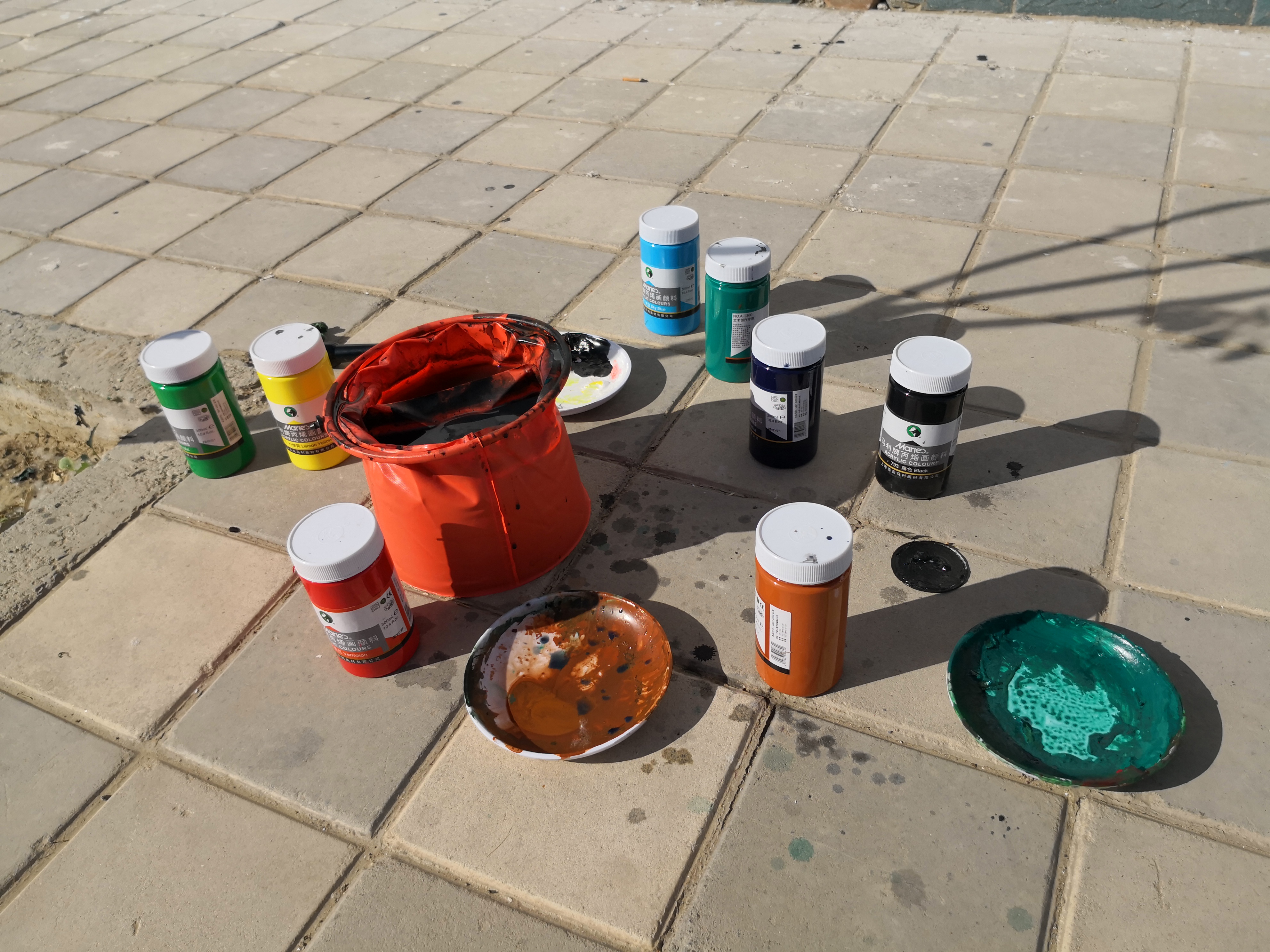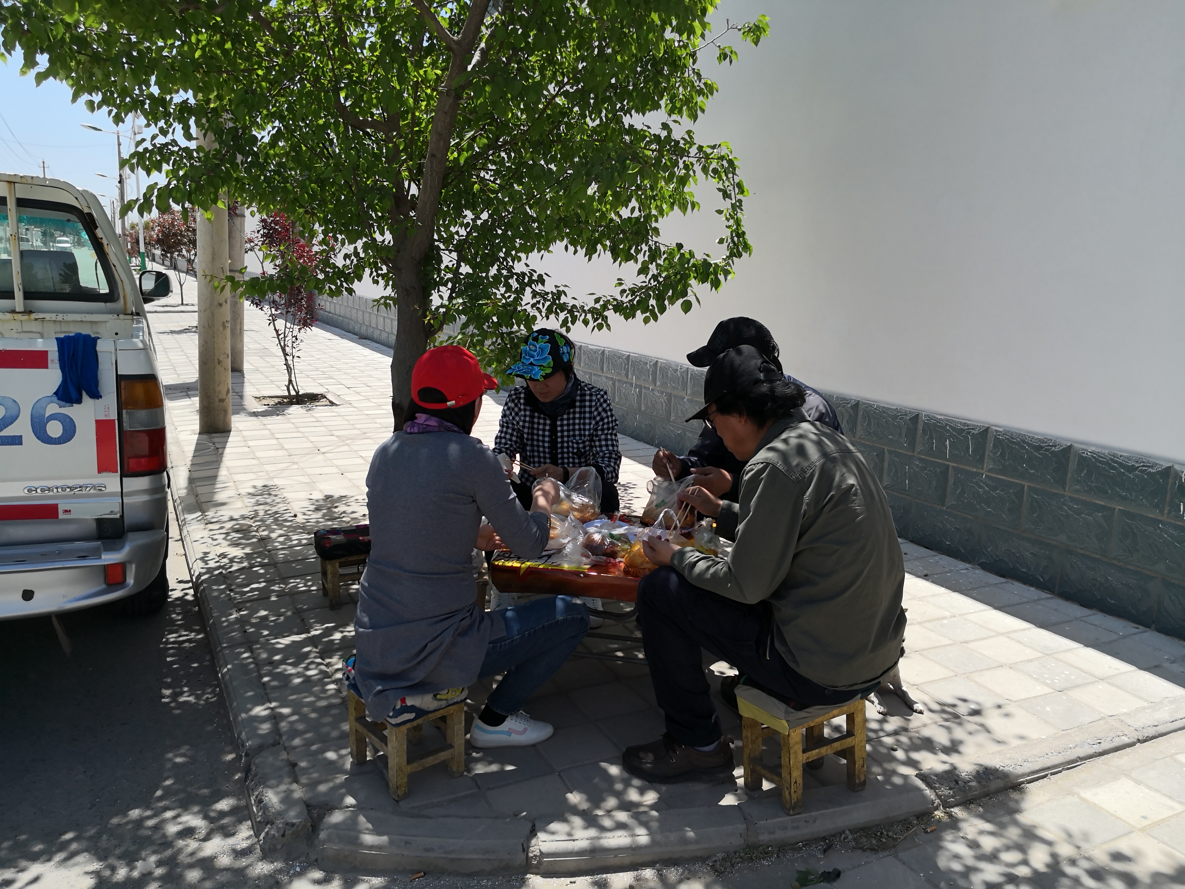 为不给村镇添麻烦,志愿者们自备干粮,就在树荫下,解决了一天的伙食。看到志愿者们如此艰苦,有的老乡主动为志愿者们搬来了桌椅板凳,有的老乡把自己买的西瓜切给志愿者,还有老乡一直给志愿者泡解渴的红枣香茶,让志愿者们心里暖暖的,画起来更有干劲。