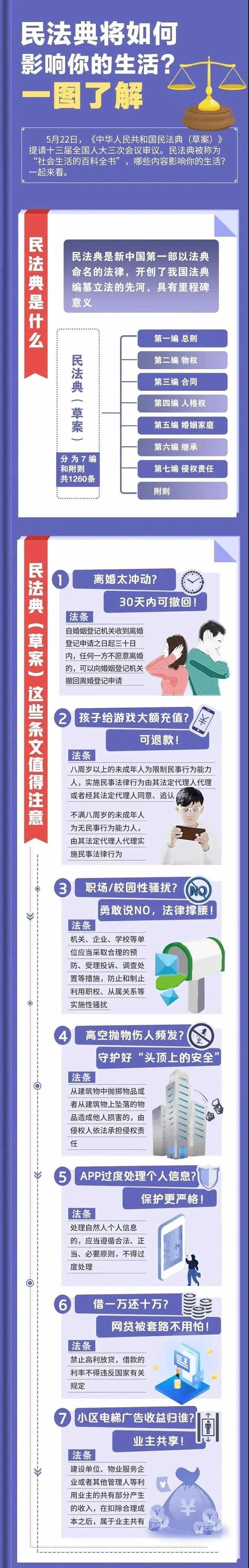 十三届全国人大三次会议表决通过的《中华人民共和国民法典》共7编、1260条,各编依次为总则、物权、合同、人格权、婚姻家庭、继承、侵权责任和附则,自2021年1月1日起施行,婚姻法、继承法、民法通则、收养法、担保法、合同法、物权法、侵权责任法、民法总则同时废止。