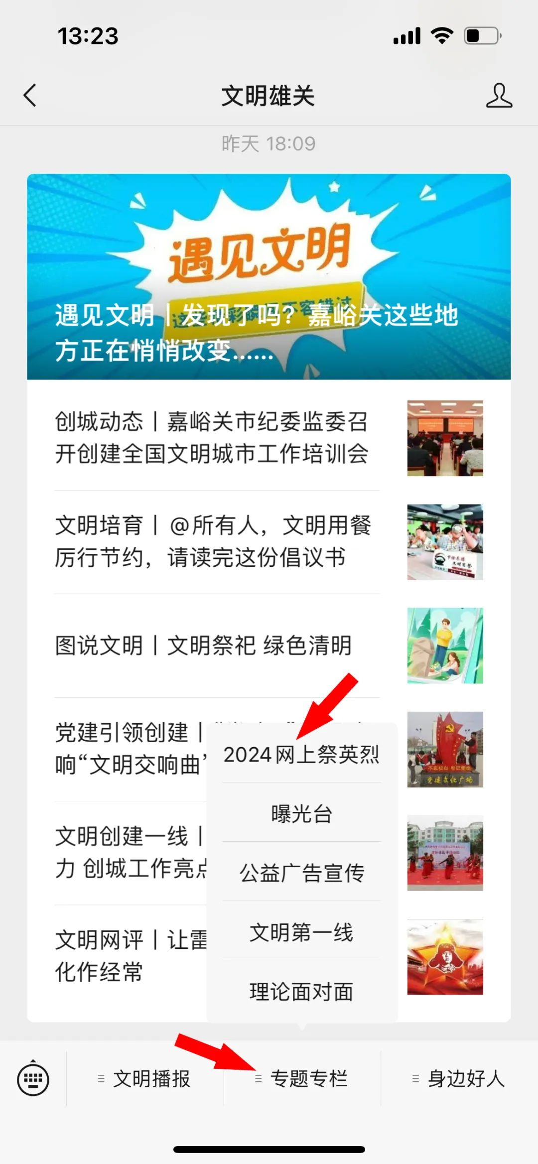 3. 关注“文明雄关”微信公众号,点击底部专题专栏→2024网上祭英烈。