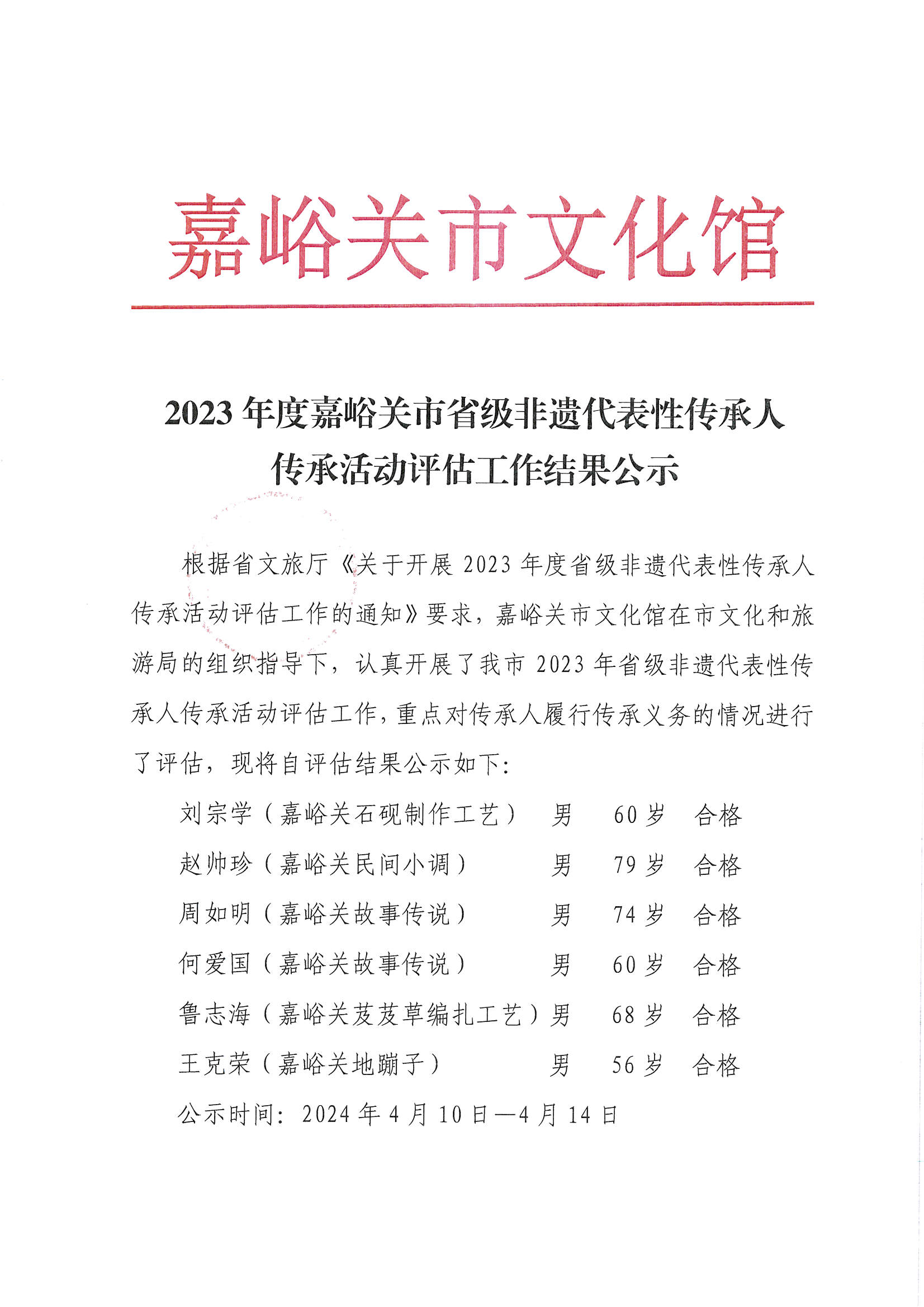 2023年度嘉峪关市省级非遗代表性传承人传承活动评估工作结果公示